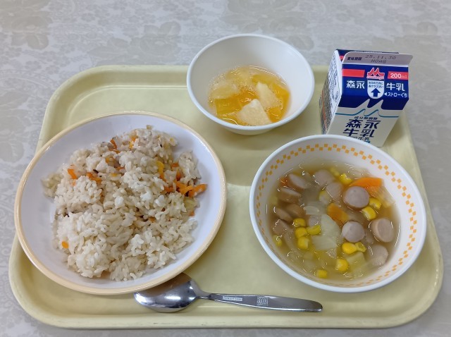 今日の給食は、ガーリックピラフ、ジャガイモのスープ煮、パインカクテル、牛乳です。