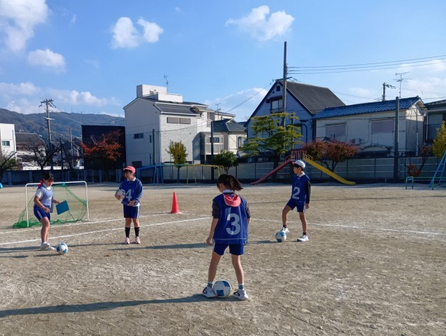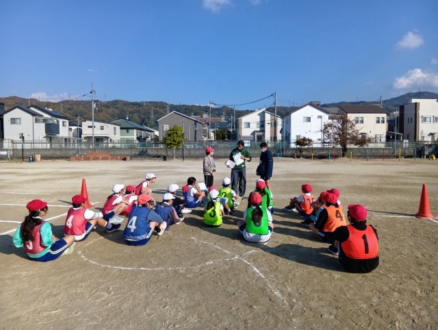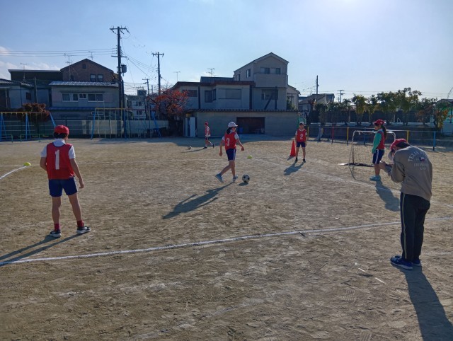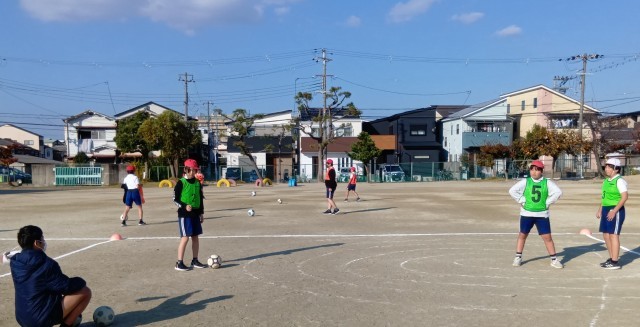 6年生体育サッカーの学習です。「スーパーアドバイザー」役の子どもたちが、「技術面」と「チームワーク面」を観察しながら、「パスをするとき、相手の名前を呼んで!」など、的確なアドバイスをしていました。
