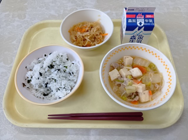 今日の給食は、和食の日(11月24日)にちなんだメニューです。わかめごはん、やっこ煮、大根のいため煮、牛乳です。