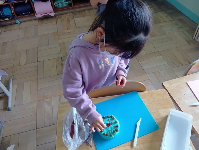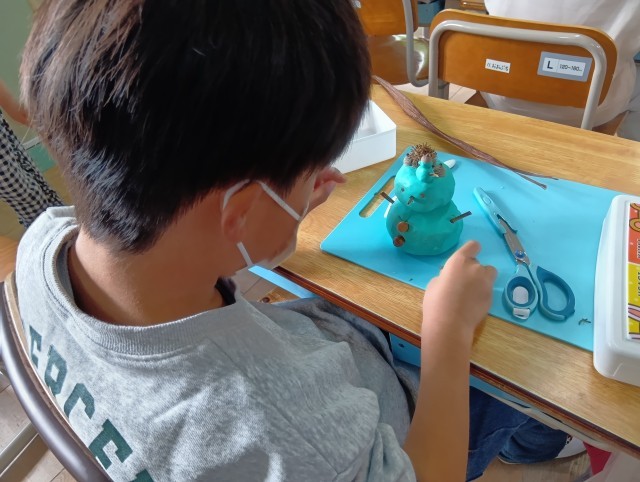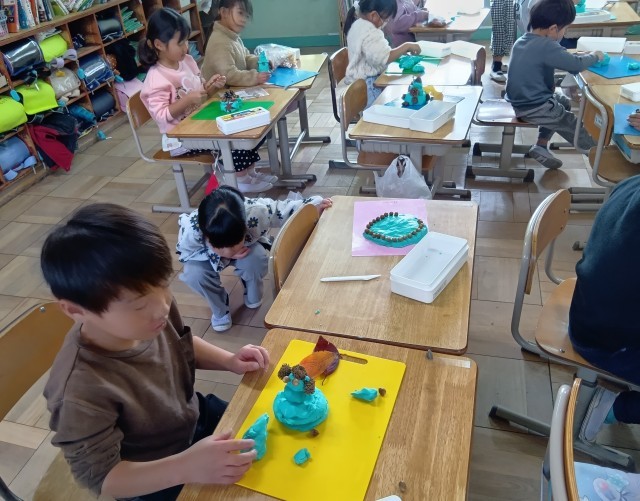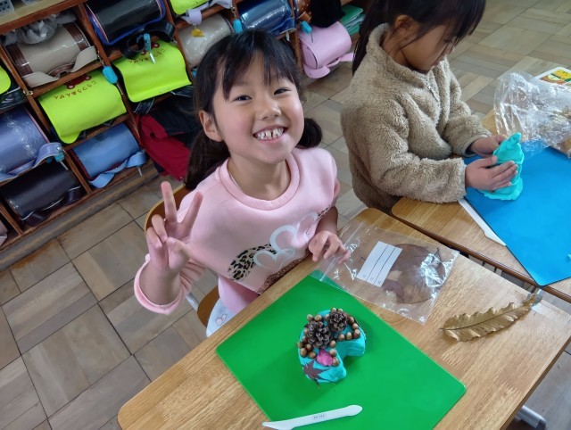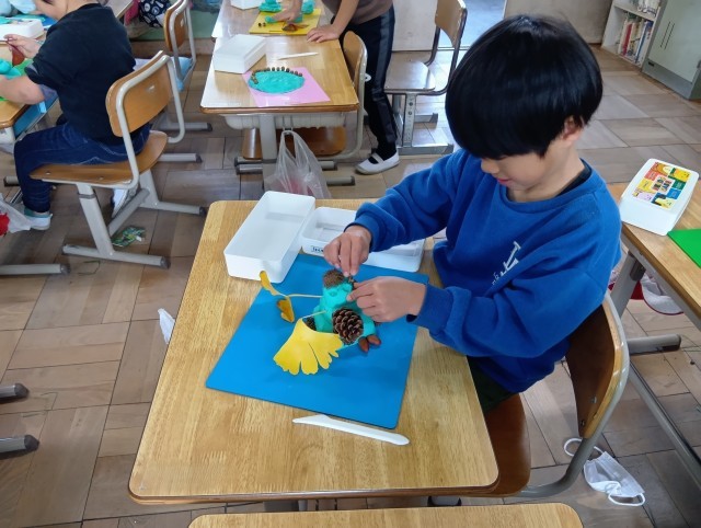 (1年)図工 自分がつくりたいケーキの土台を粘土でつくって、落ち葉や木の実でデコレーションしていきます。どの子も夢中で作品をつくっていました。子どもたちの発想は非常に柔軟ですね。