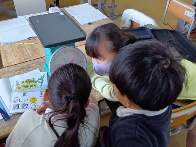 (3年)算数 はかりの使い方。「めもりは正面から読む」ということを意識しながら、身の回りのいろいろなものを図っていました。