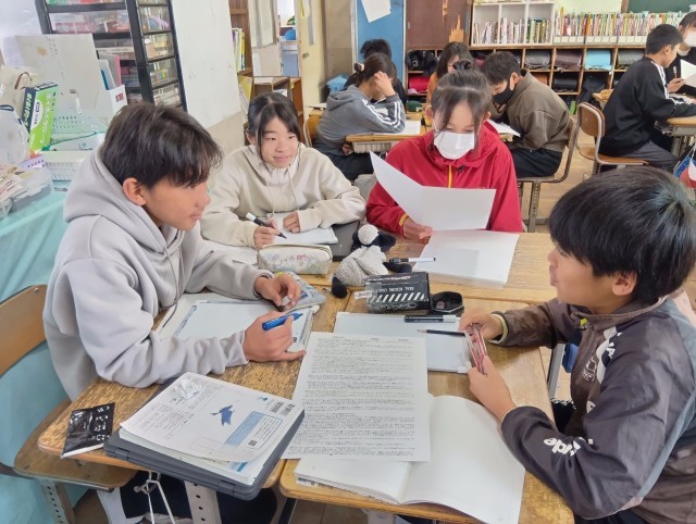 (6年)国語 「海のいのち」みんなで考えた問い「太一はなぜクエを殺さなかったのか」を交流しています。全文プリントを使って、文を根拠にしながら自分の考えを伝え合っています。