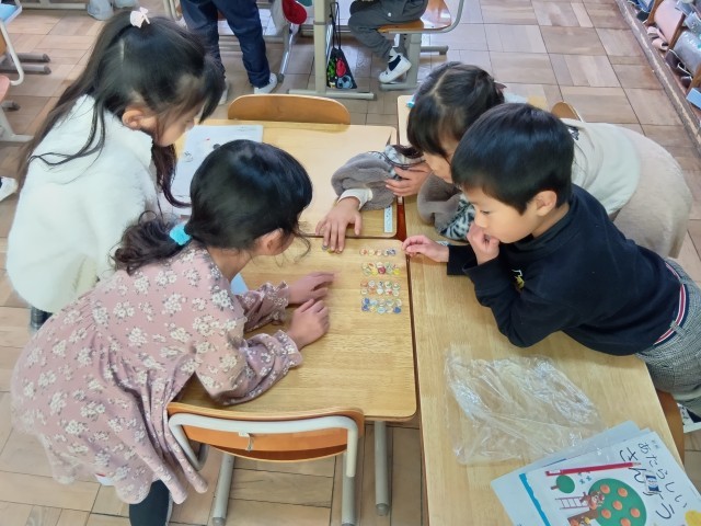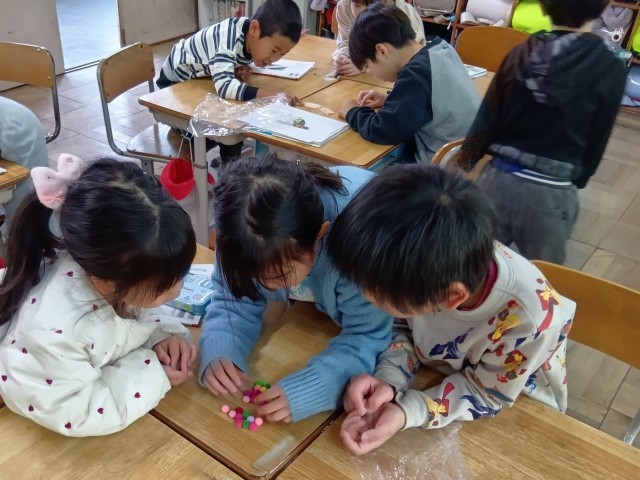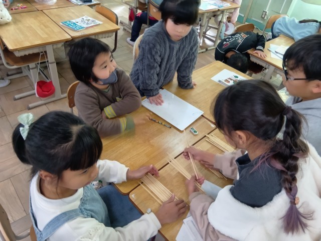 1年算数「おおきい かず」の導入です。「みんなにわかるように かずをかぞえよう」をめあてに、おはじきやわりばしなどの具体物を、班ごとにならべていました。わかりやすく伝えるために「いくつのまとまり」をつくるのかを相談していました。