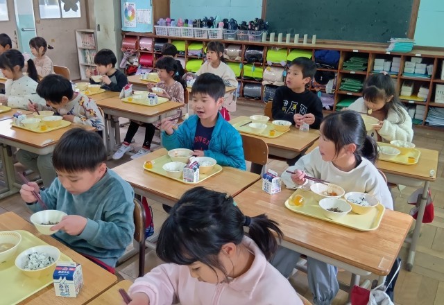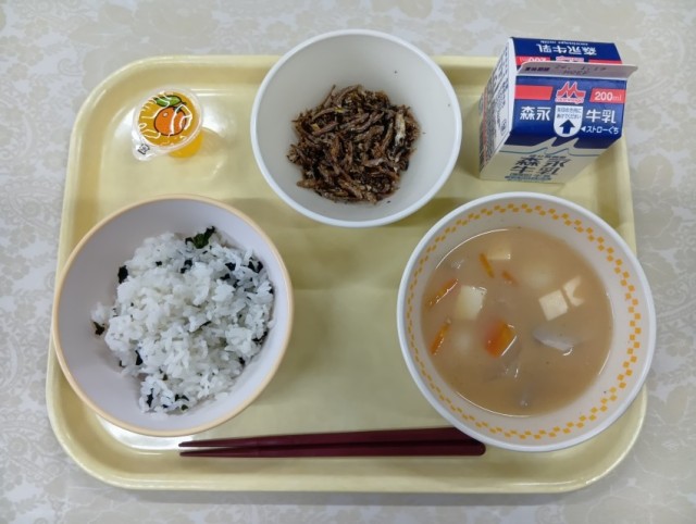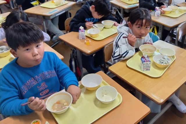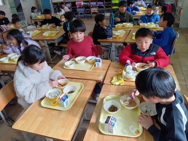 今日から3学期の給食が始まりました。今日は、ぞう煮、田作り、わかめごはん、プチゼリー(みかん)、牛乳です。「今年もよい年でありますように」と願いをこめて、お正月献立をいただきます。