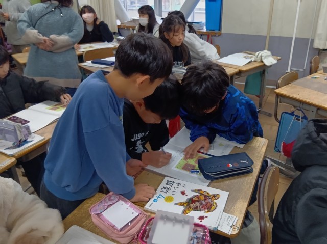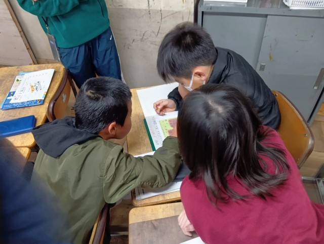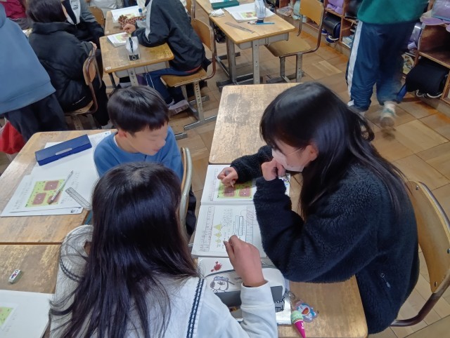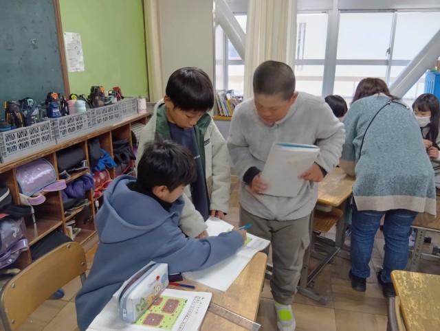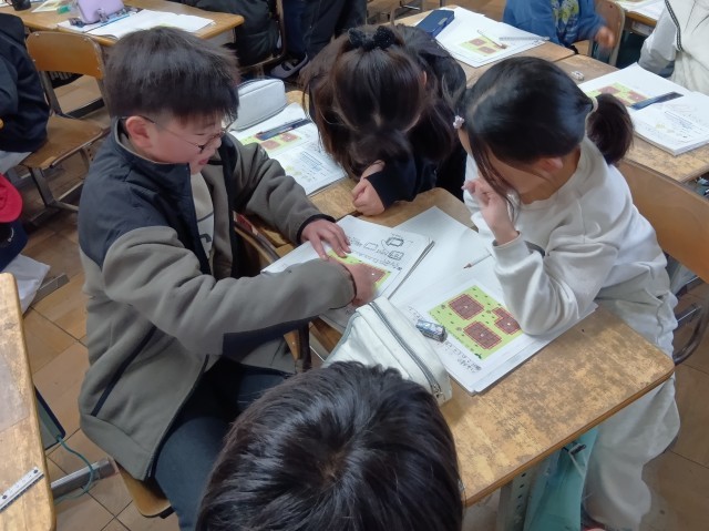 4年生算数。面積の導入です。どちらの花壇がどのくらい広いのか考えて、自分の言葉で説明しあっています。「線を引いてみたら~」「縦や横の長さをはかったら~」など、根拠をもとに活発な交流が行われていました。