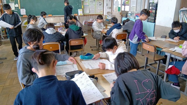 6年生の算数。「クラス全員が、『6年間の学習①』を理解できる」をめあてにして、総復習に取り組んでいました。子どもたちの単元カードには、「クラスみんなでかしこくなる!」「だれ一人みすてないチームワーク!」と、すてきな言葉が書かれています。中学校でも生かしてほしい学び方です。頑張って!