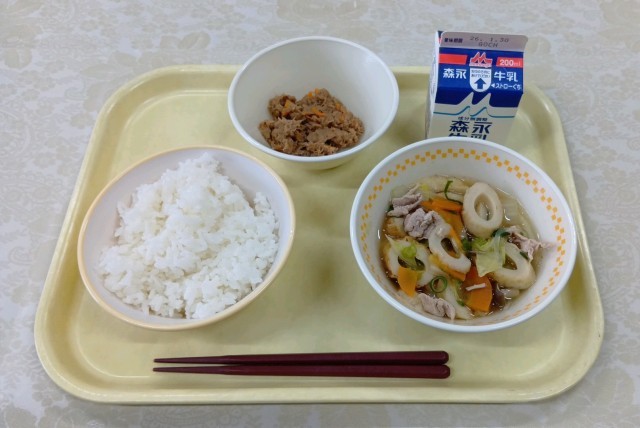 今日の給食は、ごはん、きりたんぽ風、かつおそぼろ、牛乳です。