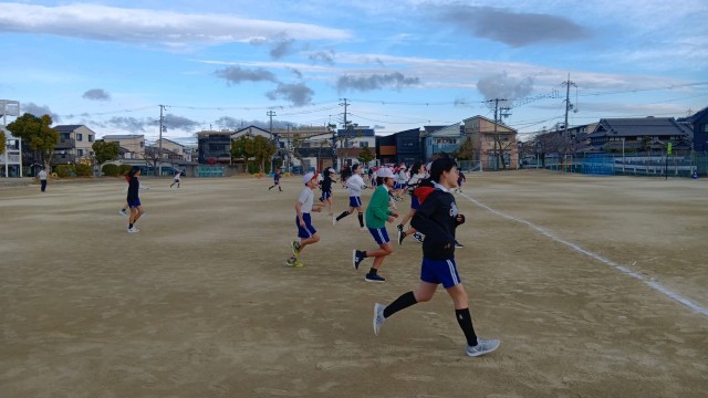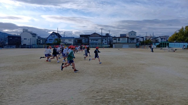 今日は、5年生の朝の体力づくりです。冷たい風の中でも、子どもたちは目標にむかって頑張っています。