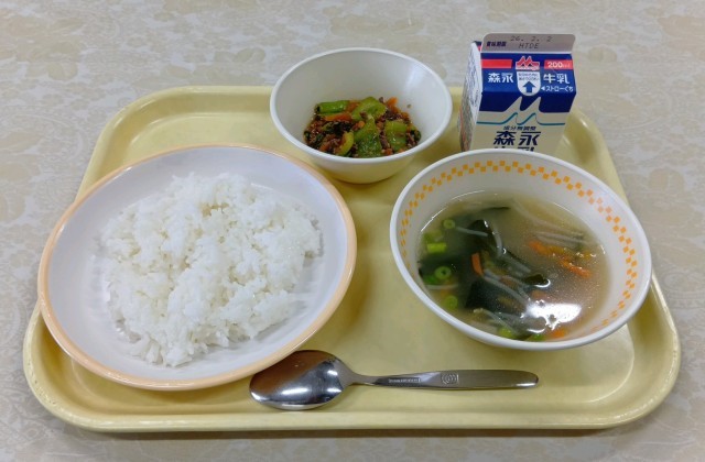 今日の給食は、ごはん、わかめトック、ビビンバ、牛乳です。