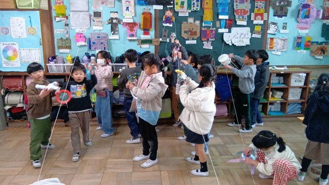 (1年)図工 「スルスルビューン」というおもちゃを改良しています。「かざりをたくさんつけたよ」「長くなるようにくっつけたよ」と、きらりと光る工夫がたくさんありました。