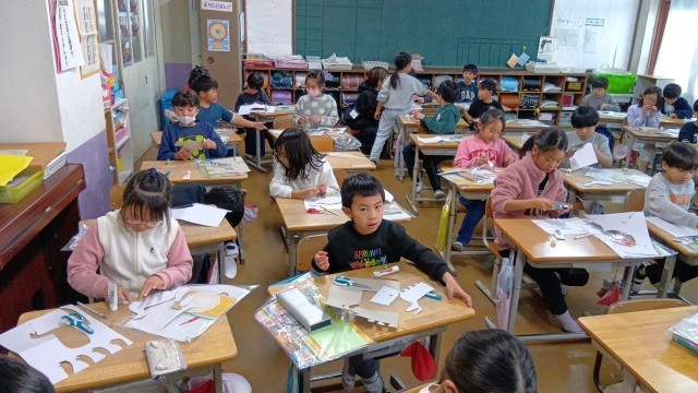 (2年)図工 紙版画で自分の恐竜を表現します。「目」の部分をはっきりと摺りだすには、ちょっとした工夫が必要です。先生の話をよく聞いて作品づくりをする子どもたちです。