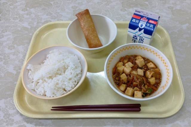 今日の給食は、ごはん、麻婆豆腐、はるまき、牛乳です。