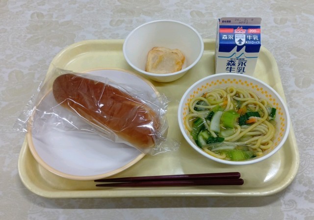 今日の給食は、黒糖ベビーパン、やさいラーメン、いかナゲット、牛乳です。