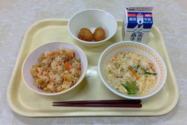 今日の給食は、豚キムチごはん、五目たまごスープ、米粉魚ナゲット、牛乳です。