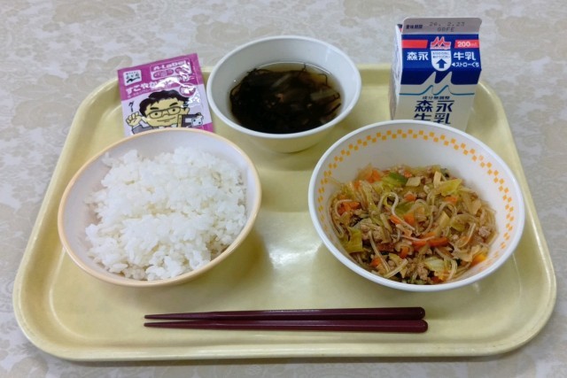 今日の給食は、ごはん、春雨のひき肉いため、もずくスープ、ふりかけ、牛乳です。