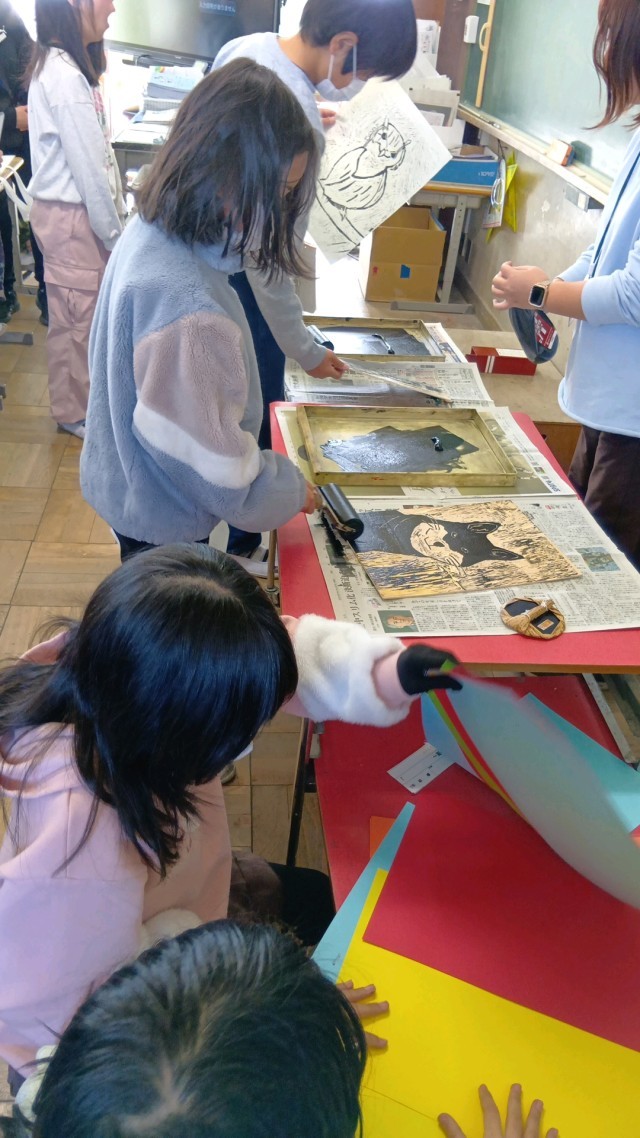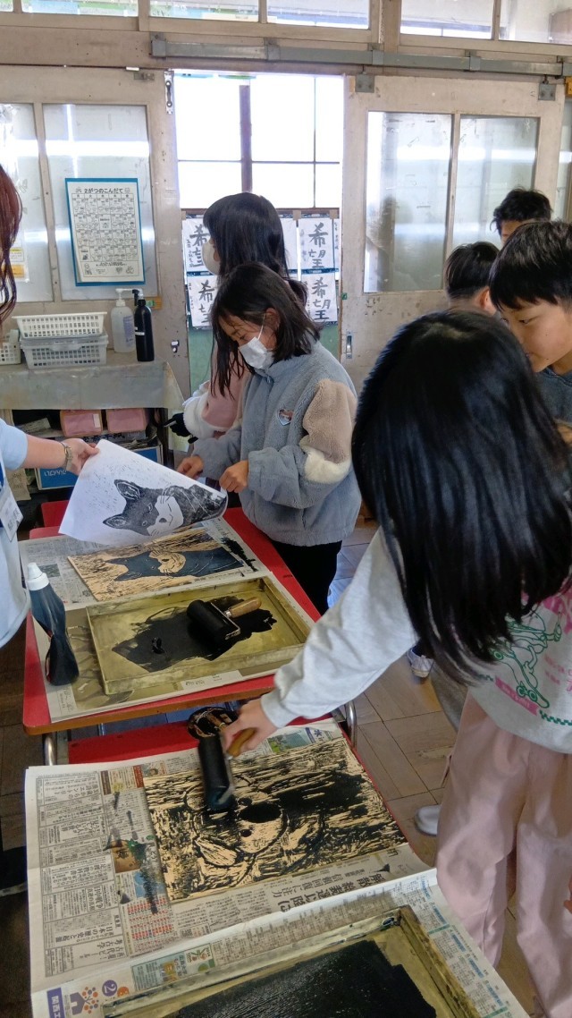 5年生の図工の様子です。彫刻刀で丁寧に彫っていたので、思い描いていたように刷り上がると、とても嬉しそうでした。