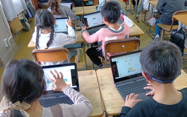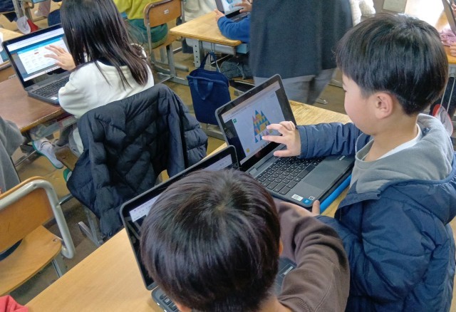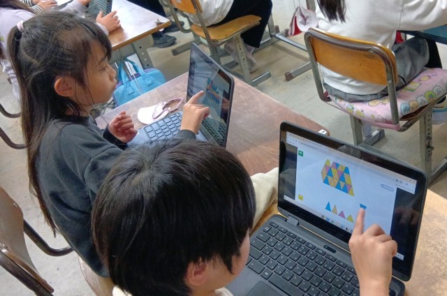 今までに学んだ「二等辺三角形」「正三角形」の性質を使って、三角形を敷き詰めて模様をつくりました。算数言葉を使い、友だちに分かりやすく説明することができました。