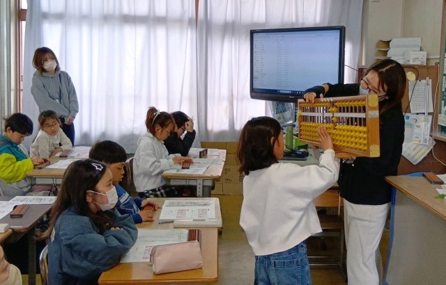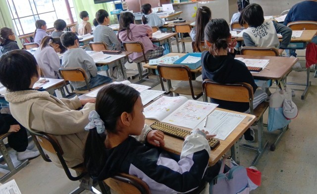 珠算協会の先生をお招きして、3年生がそろばん教室を実施しました。そろばんの使い方を教えていただき、2桁、3桁の計算にチャレンジ!また、「人間そろばん」になってそろばんの仕組みを理解するなど、そろばんの魅力を楽しく味わうことができました。