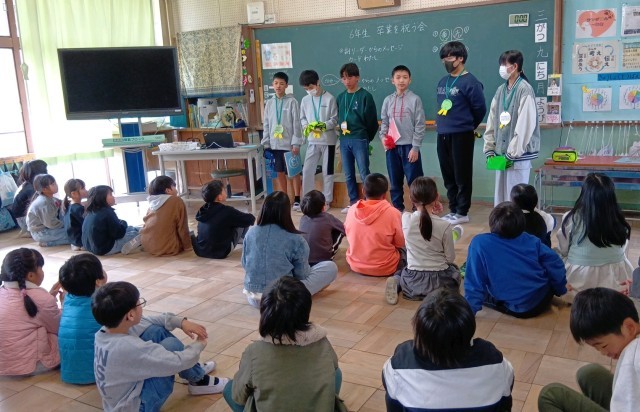泉小縦割り班活動の「にこにこ泉」で、6年生の卒業をお祝いしました。1年生からメダルのプレゼントを受け取り、5年生からお祝いの言葉を聞いたあと、各教室に分かれて6年生と一緒に遊びました。優しかった6年生。本当にお世話になりました。