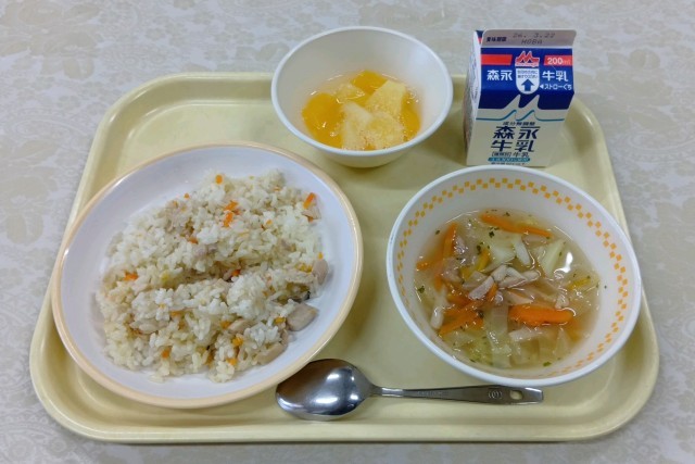 今日の給食は、チキンピラフ、野菜スープ、パインカクテル、牛乳です。