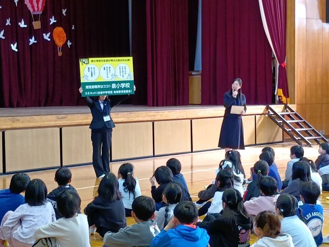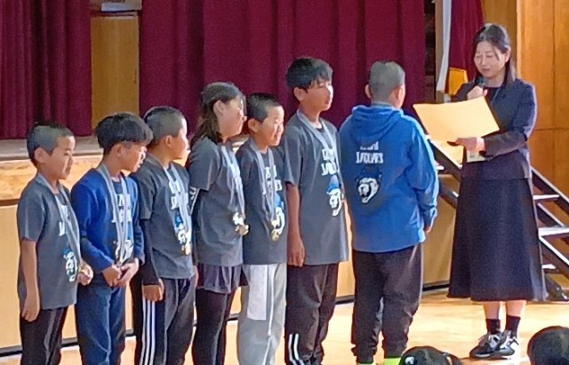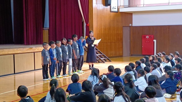 今日の修了式では、まず、軟式野球チーム「泉ジャガーズ」の市内大会優勝の表彰を行いました。頑張った成果が表れると嬉しいですね。おめでとうございます!