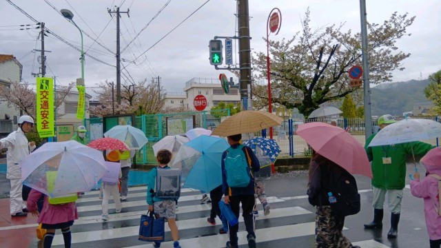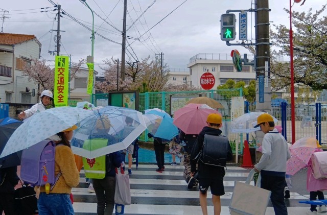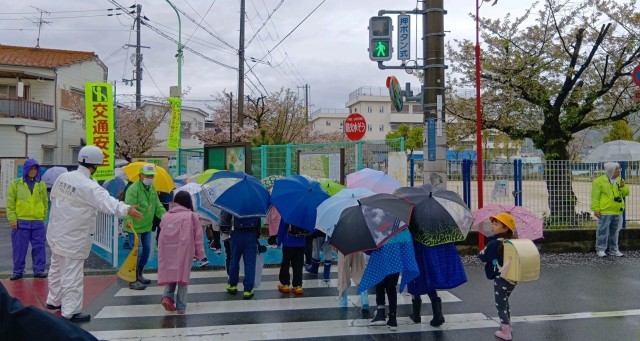 春の交通安全運動期間がはじまりました。雨の中、校門前には見守り隊の皆様に加えて、警察や市民政策課の方も子どもたちの登校を見守ってくださいました。