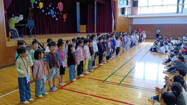 次は1年生のあいさつです。かわいらしい歌とあいさつに、在校生も思わず笑顔がこぼれます。「じょうずに言えたね!」「すてきだったよ!」の気持ちをこめて、どの学年の子どもたちも何度も何度も拍手をしていました。心のあたたかな泉の子どもたちです。
