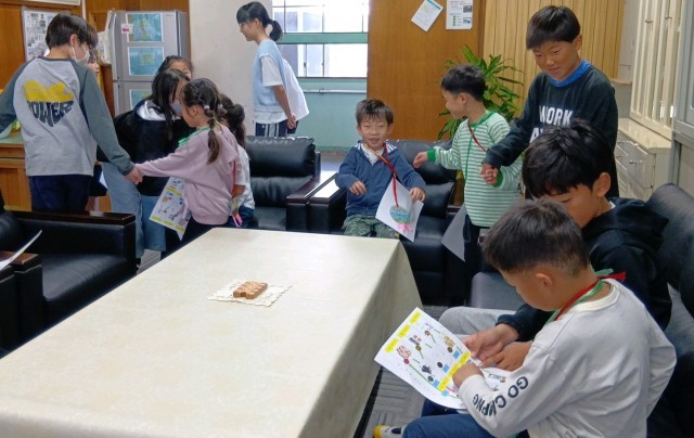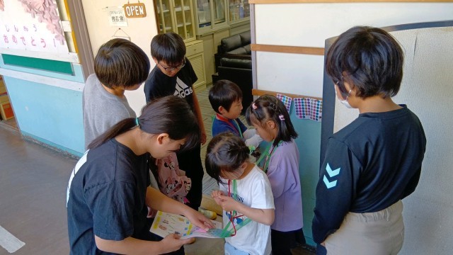 1年生と6年生がペアやグループになって、校内を探検しました。学校の色々な教室を案内してもらい、シールを集めていきます。