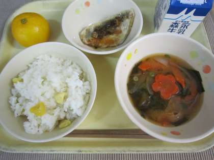 くりごはん、みそ汁、あじの薬味ソース、みかん、牛乳 です。