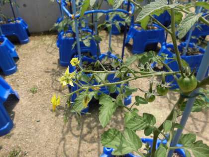 学校の植物は伸び盛りで、2年生が植えたトマトに次々と緑の実がなり始めました。