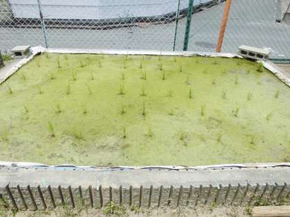先日、5年生が田植えしたところを地域の方が、雑草が生えないようにお世話しに来てくださいました。