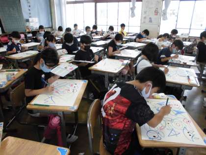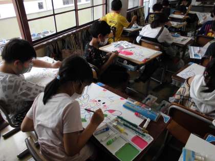 子どもたちが考えた「伝説の生き物」に色をつけています。