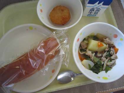ハニーパン、きのこのバター煮、コーンコロッケ、牛乳 です。