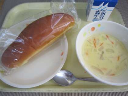 キャロットパン、豆乳ポタージュ、牛乳 です。