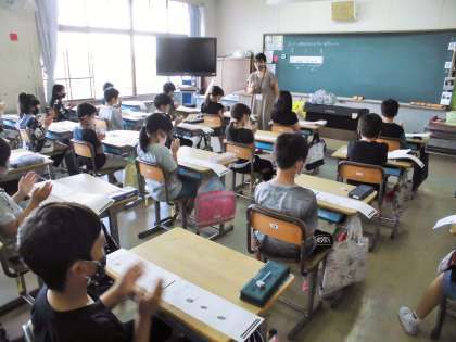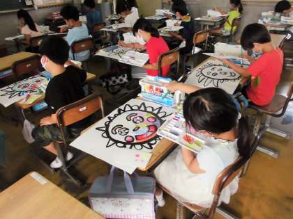 3年生は図工で「太陽の笑顔」を描いています。子どもそれぞれの個性が表れています。