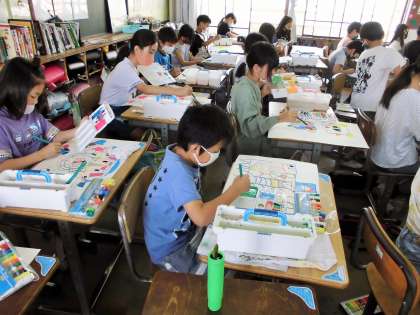 4年生は図工で「伝説の生き物」をテーマに色を工夫して塗っていました。