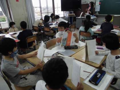 3年生は国語で「ちいちゃんのかげおくり」の学習をしています。班で教科書を読んで確かめながら、今日の課題について意見を出し合っています。