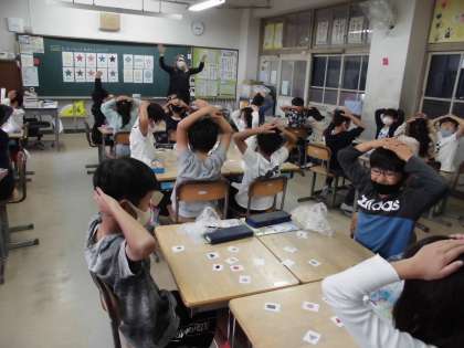 外国語活動では、AETの先生が英語で色と形を言い、かるたのように、その条件に合うカードをすばやく取るゲームをしました。子どもたちは耳をすましてよく聞き、パッとカードを取りました。大いに盛り上がりました。