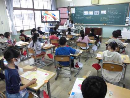 1年生が図工で円や四角や三角の形に切った色画用紙を貼って、いろいろなものに見立てて作品を作っています。算数で習ったことを図工でも使うのも学習の応用です。