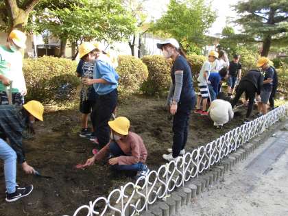 環境委員会は花壇の土を耕しています。