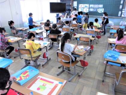 図工では算数で習ったいろいろな形の色画用紙を使って、作品を作っています。みんなそれぞれ工夫しています。