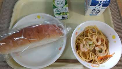 コッペパン、和風スパゲティ、野菜ジュース、牛乳 です。