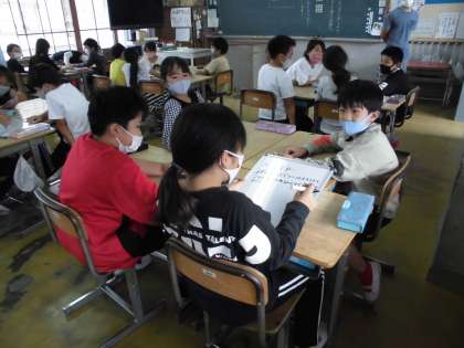 3年生は国語で「はんで意見をまとめる」話し合いの学習をしています。「もし教室で動物を飼うとしたらどんな動物を飼いたいか」というテーマで話し合っています。ハムスターや犬、トラもありましたよ。なぜその動物を飼いたいか理由をしっかりと考えることが大事です。