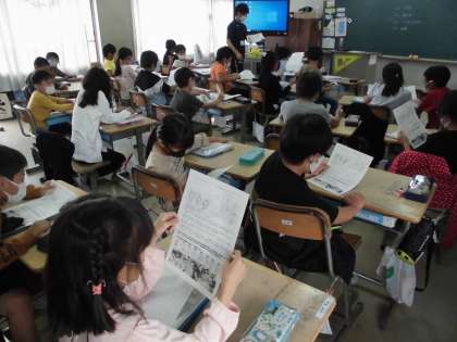 学級通信を配ってもらって子どもたちが見ています。みんなとご家庭と先生をつなぐ大事なお手紙です。