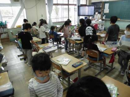 学習前の配付物がたくさんあっても、みんなで協力してどんどん配っていきます。