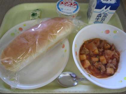コッペパン、とうふのチリソース煮、ヨーグルト、ノンアレルゲンマーガリン、牛乳 です。