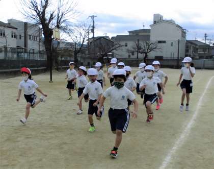 1年生は体育でひとクラスがマラソン記録会を行いました。運動場のトラック大回り5周がコースでしたが、最後まで全員が走りきることができました。よく頑張りました。