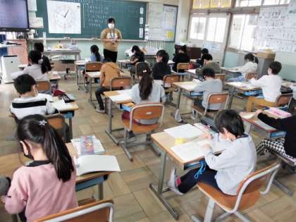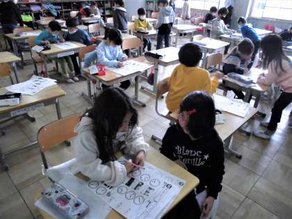 算数では時計の学習をしています。小さなひと目盛が1分を表し、大きな目盛が5分を表すことを習いました。練習問題にも友だちと教え合いながら取り組みました。