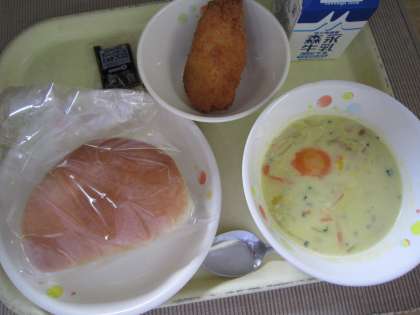 パーカーパン、コーンクリームスープ、白身魚フライ、ソース、牛乳 です。