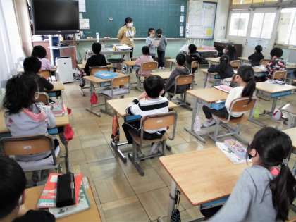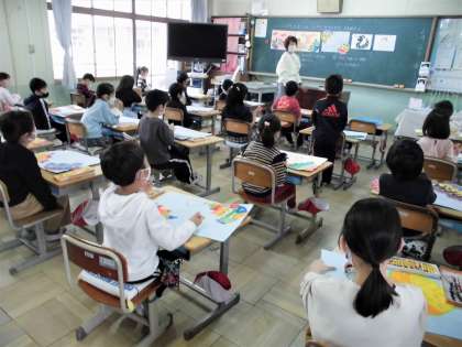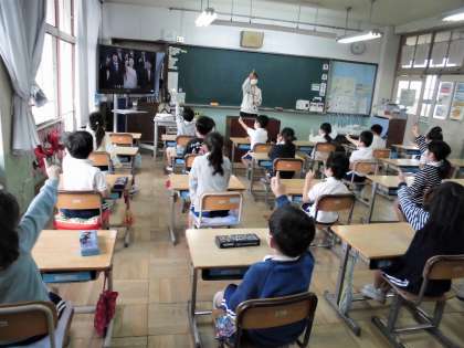 1年生は朝の会で手話を使って歌いました。人差し指を挙げていますが、曲目は「世界にひとつだけの花」です。毎朝、手話でうたっているので、もう覚えたよという子もいました。